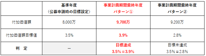 申請者自身で付加価値額基準値以上の目標値を設定し、事業計画期間最終年度において当該付加価値額目標値を達成することが必要です。